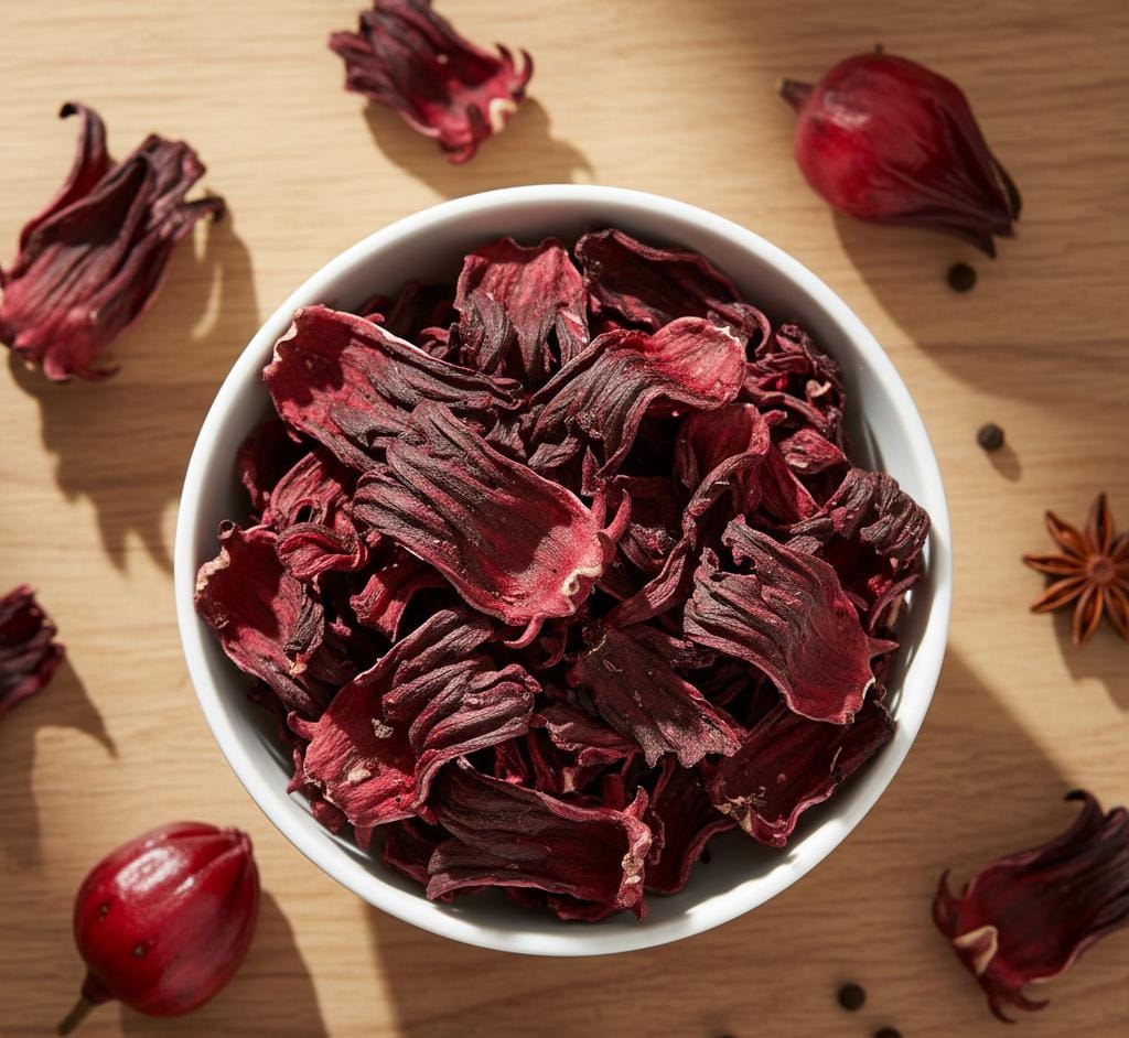 Dried hibiscus with a tangy taste and rich red color, used in drinks and natural coloring.